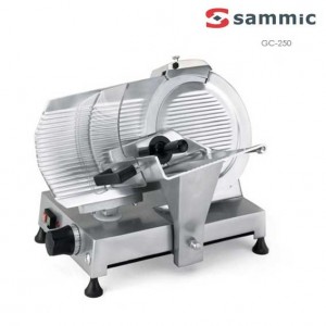 Cortadora de fiambres GC-250 de Sammic para hostelería y cocinas industriales en general. La pequeña de la gama es apta para producciones bajas o medias. Cortadora de fiambre con transmisión por correa. El modelo GC de Sammic está construido con una aleación especial de aluminio anodizado, higiénico y anticorrosivo. Dispone de afilador no extraible de fácil uso. Fácil de limpiar.