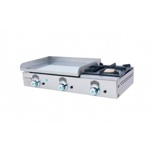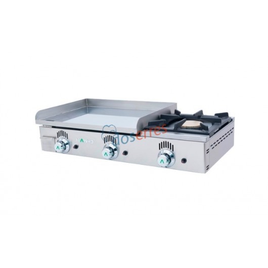 Plancha de Cromo duro con fogón. La placa es de 15 mm de espesor, lleva un cajón recoge grasas en el frontal . Provista de válvula termostática y conmutador de encendido.